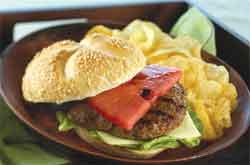 Grill the hamburgers almost to desired doneness. Thirty seconds before they are done, place a slice of cheese atop each burger. Place the watermelon slices on the grill, just to warm them, and dust with the pepper to taste. Assemble the burgers on the buns with a slice of warmed watermelon on top of each. Enjoy! (You will.)